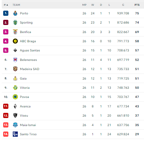 Galutinės lentelės lyderiai: „Porto“ – 75, Lisabonos „Sporting“ – 74, Lisabonos „Benfica“ – 69, Bragos ABC – 58, Majos „Aguas Santas“ – 57.