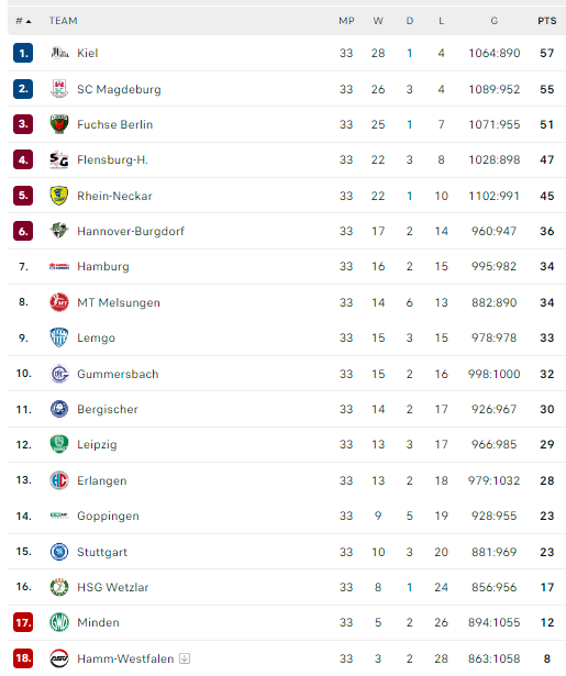 Pirmauja: „Kiel“ – 57, „Magdeburg“ – 55, „Füchse“ – 51, „Flensburg“ – 47, „Rhein-Neckar“ – 45, „Hannover“ – 36, „Hamburg“, „Melsungen“ – po 34, … „Stuttgart“ – 23.