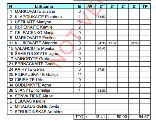 Lietuva – Slovėnija 31:35 (12:18). Pilikauskaitė 11, Kairytė 6, Ustilaitė 5, Gudlinkytė 3, Rupeikaitė 2, Bernackaitė 2, Klapčiukaitė 1, Stanytė 1 / Žulič 11.