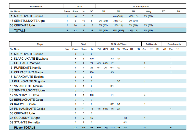 Lietuva – Ispanija 22:38 (9:19). Pilikauskaitė 8, Ustilaitė 5, Klapčiukaitė 3, Čelpačenko 3, Rupeikaitė 1, Gudlinkytė 1, Vainorytė 1 / Sarrionandia 7, Poles 6.