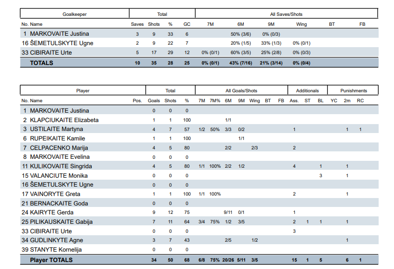 Lietuva – Slovėnija 34:25 (20:12). Kairytė 9, Pilikauskaitė 7, Ustilaitė 4, Čelpačenko 4, Kulikovaitė 4, Gudlinkytė 3, Klapčiukaitė 1, Rupeikaitė 1, Vainorytė 1 / Matekovič 7.