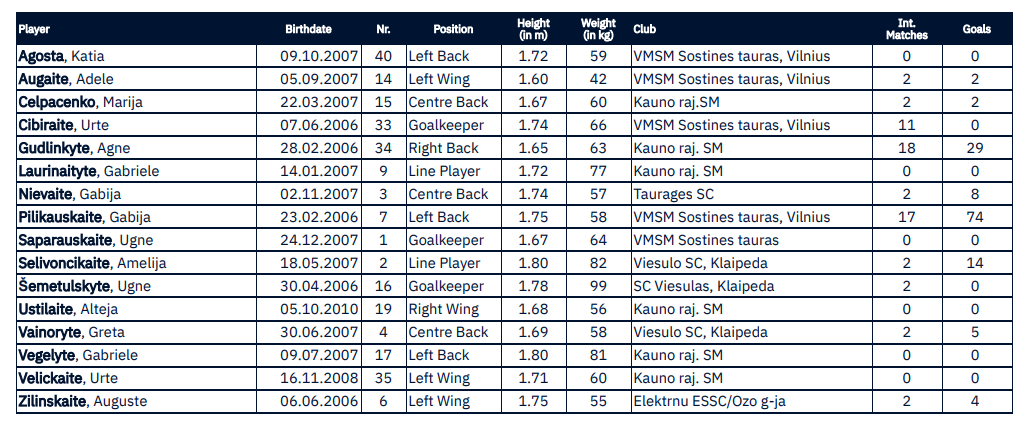 „Rinktinės lyderės įgijo daug patirties Klaipėdoje vykusiose Europos 19-mečių pirmenybėse. Jose žaidė net šešios mūsų komandos rankininkės. Mūsų starto sudėtis – stipri, bet trūksta lygiaverčių keitimų. Aišku, rankininkėms gali sutrukdyti nuovargis, nes jos žais antrame turnyre per mėnesį“, – Lietuvos rankinio federacijos interneto svetainei sakė rinktinės trenerė Ernesta Žilienė.