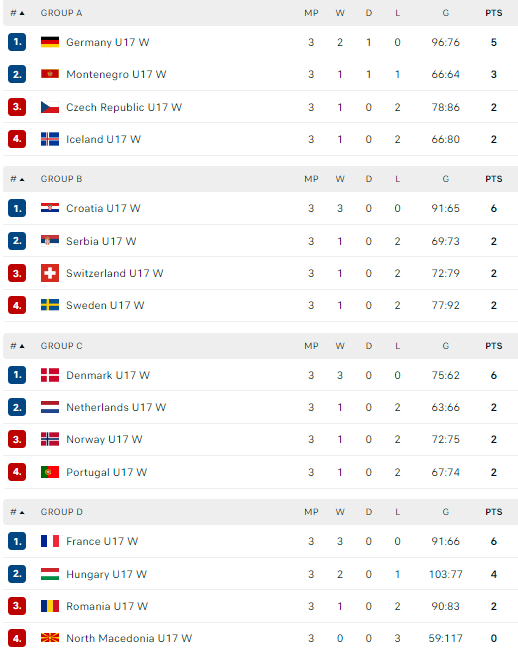 Juodkalnijos sostinėje Podgoricoje vykstančiose Europos merginų (iki 17 m.) sekmadienį baigėsi pirmasis etapas. Per jį paaiškėjo aštuonios komandos, kurios tęs kovą dėl medalių antrajame etape.