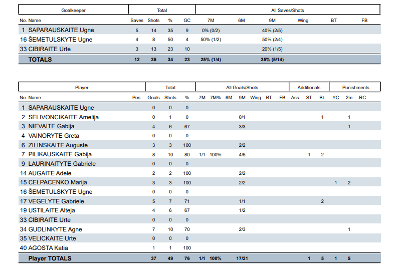 Rezultatyviausiai Lietuvos rinktinėje žaidė Gabija Pilikauskaitė (8 įvarčiai) ir Agnė Gudlinkytė (7 įvarčiai).