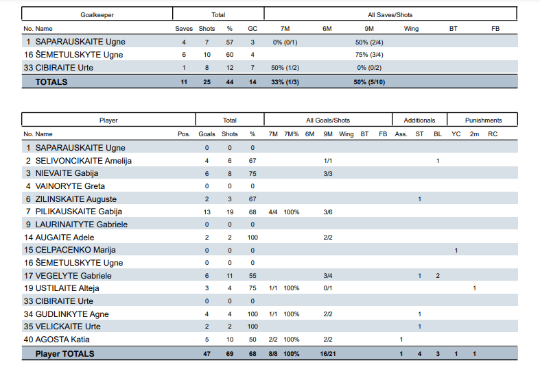 Lietuva – Azerbaidžanas 47:14 (29:4). Pilikauskaitė 13, Nievaitė 6, Vėgėlytė 6, Agosta 5, Selivončikaitė 4, Gudlinkytė 4, A.Ustilaitė 3, Žilinskaitė 2, Augaitė 2, Veličkaitė 2 / Kazimova 3, Gulijeva 3.