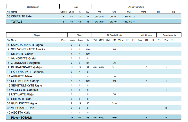 Lietuva – Slovėnija 28:33 (14:16). Pilikauskaitė 11, Gudlinkytė 7, Čelpačenko 4, Selivončikaitė 3, Žilinskaitė 2, Nievaitė 1 / Pogorelc 8.