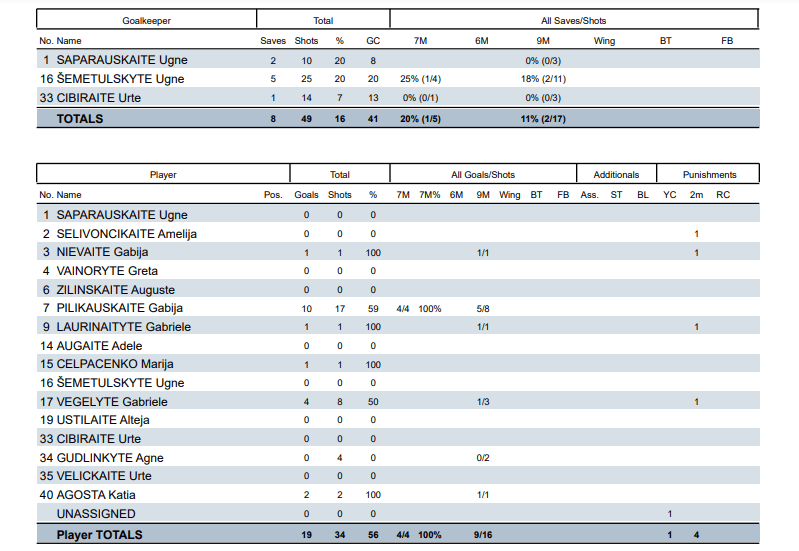 Lietuva – Ispanija 19:41 (8:19). Pilikauskaitė 10, Vėgėlytė 4, Agosta 2, Nievaitė 1, Čelpačenko 1, Laurinaitytė 1 / Solis 9.
