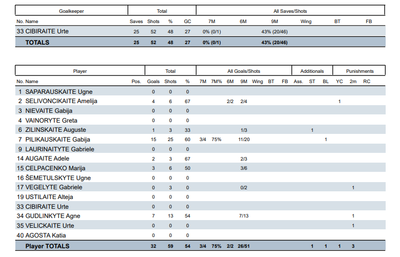 Lietuvos komandai beveik pusę įvarčių pelnė Gabija Pilikauskaitė. Ji varžovių vartininkes nuginklavo 15 kartų.