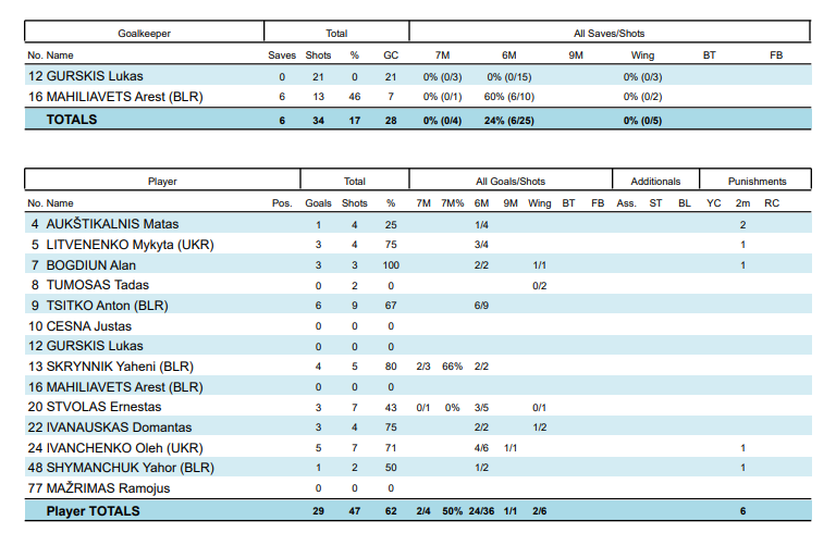 „Amber“: Citko 7, Skrynnikas 4, Ivančenko 4, Litvinenko 3, Bogdiunas 3, Stvolas 3, Ivanauskas 3, Aukštikalnis 1, Šymančukas 1.