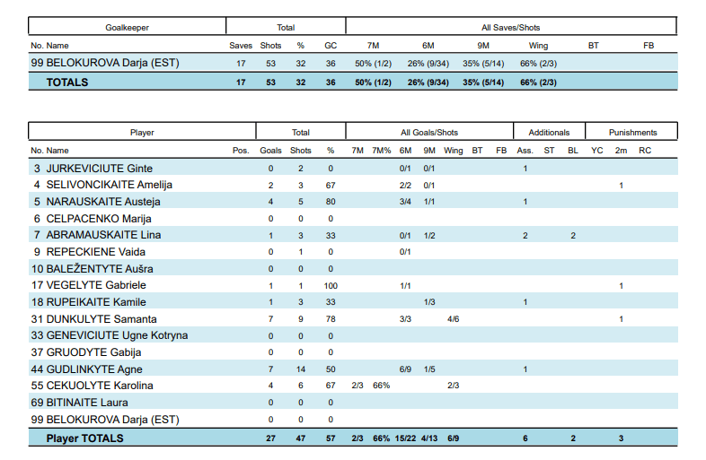 „Žalgiris“: Dunkulytė 7, Gudlinkytė 7, Narauskaitė 4, Čekuolytė 4, Selivončikaitė 2, Abramauskaitė 1, Vėgėlytė 1, Rupeikaitė 1.