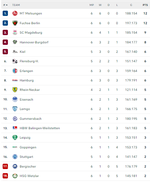 Pirmauja: „Melsungen“, „Füchse“ – po 12, „Magdeburg“ – 9, „Hannover“ – 8, … „Stuttgart“ – 2.