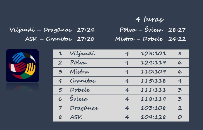 Po ketvirtojo turo tris pirmąsias vietas užima Estijos klubai. 8 taškus iškovojo „Viljandi“, po 6 taškus – „Serviti“ ir „Mistra“. Ketvirtąją vietą užimantis „Granitas“ turi 4 taškus.