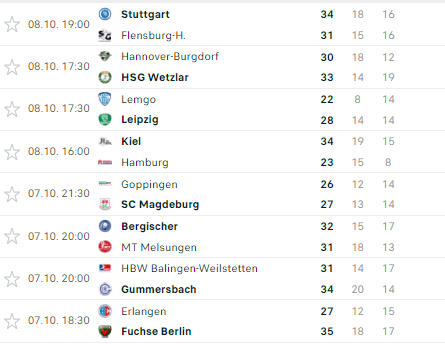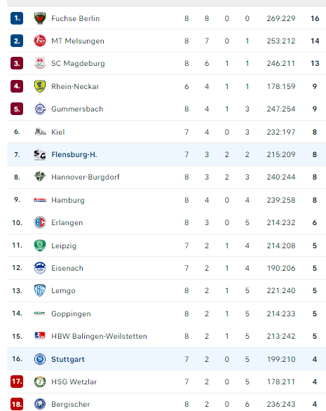 Pirmauja: „Füchse“ – 16, „Melsungen“ – 14, „Magdeburg“ – 13, „Rhein-Neckar“, „Gummersbach“ – po 9, … „Stuttgart“ – 4.