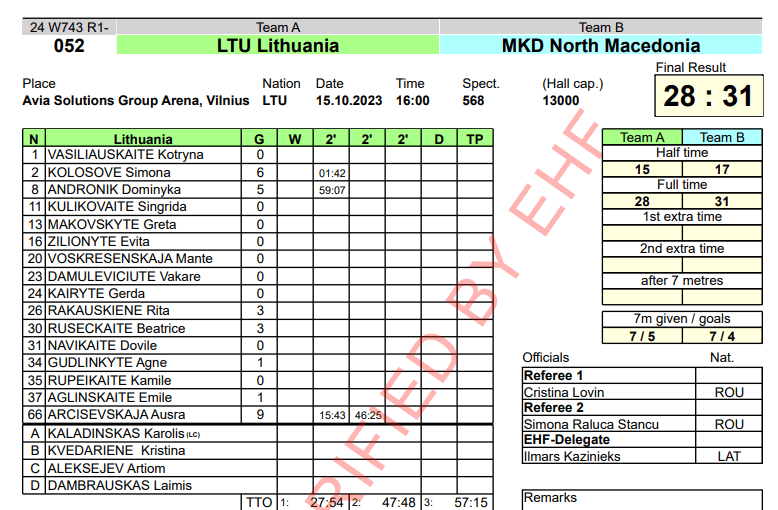 Lietuva – Šiaurės Makedonija 28:31 (15:17). 568 žiūrovai.