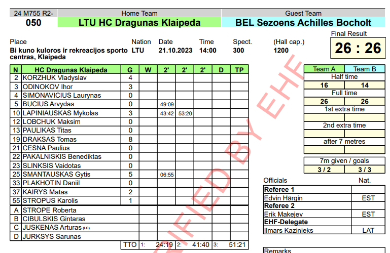 Klaipėdos „Dragūnas“ – Bocholto „Achilles“ 26:26 (16:14). 300 žiūrovų.