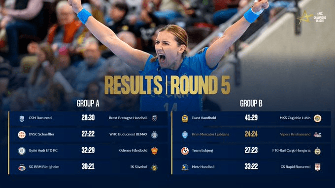 Labiausiai intrigavusiose kitos grupės rungtynėse nugalėtojos nepaaiškėjo. Sezoną nelauktai stipriai pradėjusi Liublianos „Krim“ namie sužaidė lygiosiomis su čempionės vardą ginančia Kristiansando „Vipers“ 24:24.