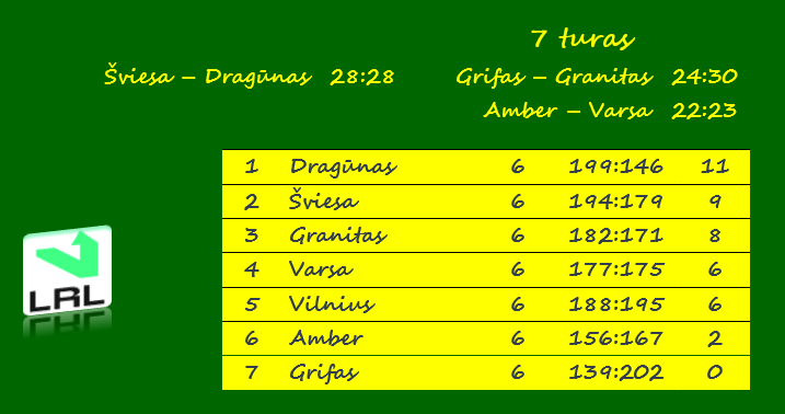Šiomis rungtynėmis baigėsi pirmasis ratas. Visoms komandoms sužaidus po šešerias rungtynes pirmauja nė karto nepralaimėjęs ir 11 taškų iškovojęs „Dragūnas“. Dviem taškais atsilieka „Šviesa“, trimis – „Granitas“.