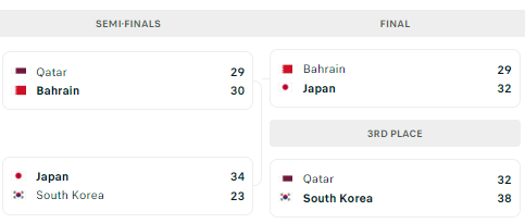 Ketvirtadienį pusfinalyje Japonija nugalėjo Korėją 34:23 (15:9), Bahreinas – Katarą 30:29 (15:14). Islando Daguro Sigurdssono treniruojami japonai per visą turnyrą nepatyrė nė vienos nesėkmės. Tekančios saulės šalies komanda visas rungtynes laimėjo ir grupės varžybose.