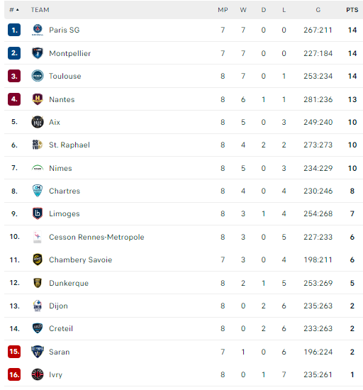 Pirmauja: PSG, „Montpellier“, „Toulouse“ – po 14, „Nantes“ – 13, „Aix“, „St.Raphael“, „Nimes“ – po 10.
