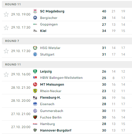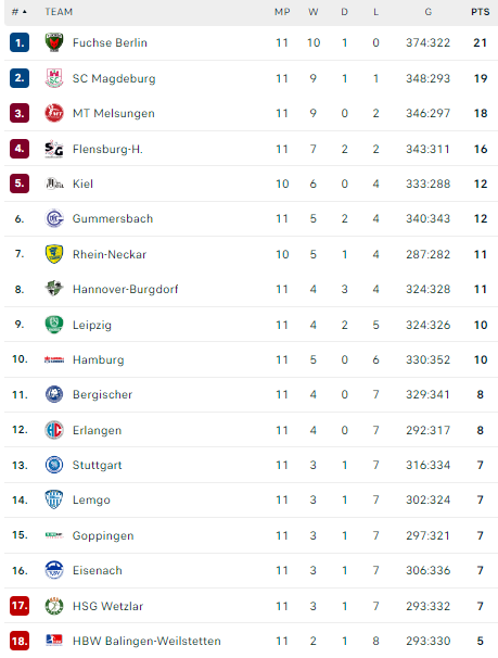 Pirmauja: „Füchse“ – 21, „Magdeburg“ – 19, „Melsungen“ – 18, „Flensburg“ – 16, „Kiel“, „Gummersbach“ – po 12, … „Stuttgart“ – 7.