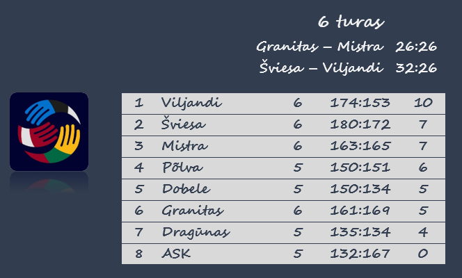 Nepaisant pirmosios nesėkmės, „Viljandi“ tvirtai užima pirmąją vietą. Ši komanda per šešerias rungtynes iškovojo 10 taškų. Antrąją vietą dalijasi po 7 taškus turinčios „Šviesa“ ir „Mistra“. „Granitas“ turi 5 taškus, mažiau rungtynių žaidęs „Dragūnas“ – 4.