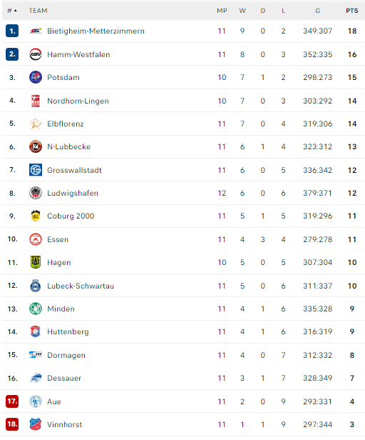 Pirmauja: „Bietigheim“ – 18, „Hamm“ – 16, „Potsdam“ – 15, „Nordhorn“, „Elbflorenz“ – po 14, „N-Lübbecke“ – 13.
