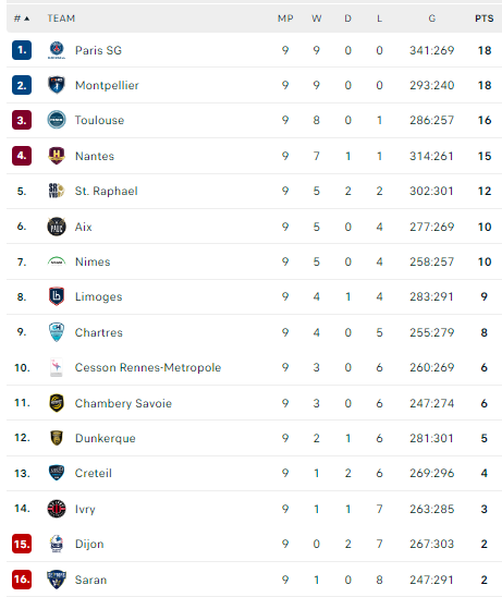 Pirmauja: PSG, „Montpellier“ – po 18, „Toulouse“ – 16, „Nantes“ 15, „St.Raphael“ – 12, „Aix“, „Nimes“ – po 10.
