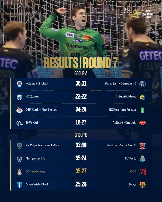 Vyrų rankinio Čempionų lygos komandos šią savaitę žaidė paskutines pirmojo rato rungtynes. Patyrusios mažiausiai nuostolių grupių varžybų pusiaukelę pasiekė B grupės lyderės „Barcelona“ ir „Veszprém“ komandos, kurios per 7 rungtynes iškovojo po 12 taškų. A grupėje pirmauja 10 taškų iškovojęs „Kiel“.