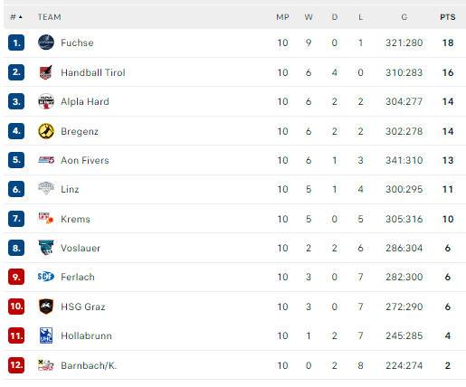 Pirmauja: „Füchse“ – 18, „Tirol“ – 16, „Alpla“, „Bregenz“ – po 14, „Fivers“ – 13, … „Vöslau“ – 6.