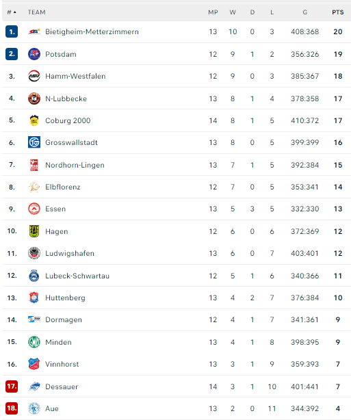 Pirmauja: „Bietigheim“ – 20, „Potsdam“ – 19, „Hamm“ – 18, „N-Lübbecke“, „Coburg“ – po 17, … „Elbflorenz“ – 14.