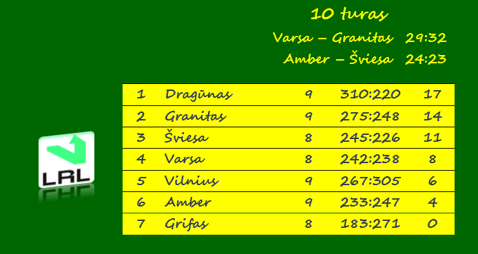 Šeštadienį kitose Lietuvos lygos rungtynėse Kauno „Granitas“ išvykoje pavijo šešių įvarčių skirtumu pirmavusius varžovus ir nugalėjo Alytaus „Varsą“ 32:29 (16:18).