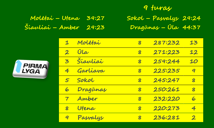 „Molėtai“ per aštuonerias rungtynes iškovojo 13 taškų, „Ūla“ – 12, į trečiąją vietą pakilę „Šiauliai“ – 10. Įdomu, kad „Ūla“ per pirmąjį ratą patyrė du pralaimėjimus. Tuo tarpu „Molėtai“ nepralaimėjo nė karto, bet trejas rungtynes baigė lygiosiomis.