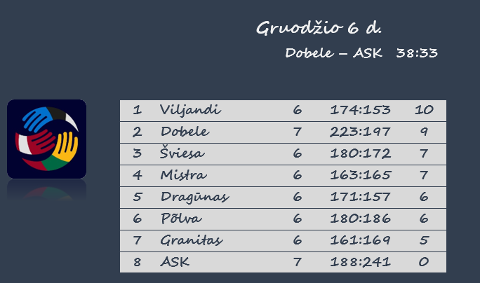 Baltijos vyrų rankinio lygoje trečiadienį antrąsias tarpusavio rungtynes žaidė Latvijos komandos. Kaip ir reikėjo tikėtis, Latvijos čempionas Duobelės „Tenax“ nugalėjo Rygos ASK rankininkus 38:33.