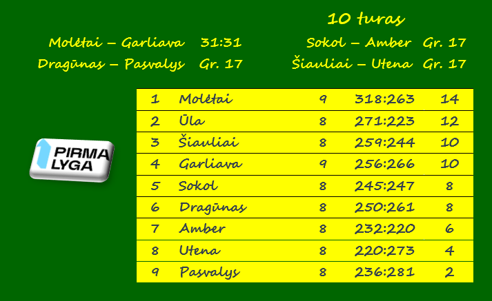 „Molėtai“ – „Garliava“ 31:31 (14:14).Agurkis 7, Dikas 6 / Boguševičius 11, Rameikis 6, Pilypas 5.