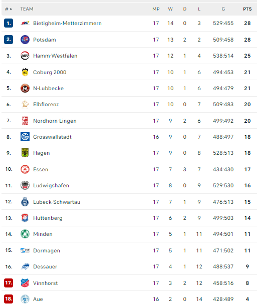 Pirmauja: „Bietigheim“, „Potsdam“ – po 28, „Hamm“ – 25, „Coburg“, „N-Lübbecke“ – po 21, „Elbflorenz“, „Nordhorn“ – po 20.
