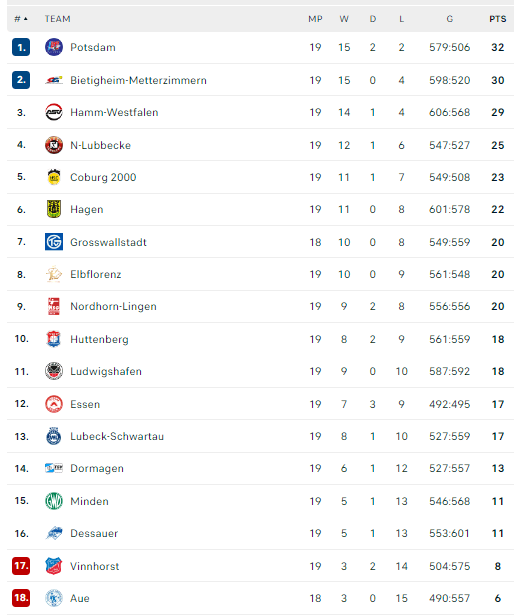 Pirmauja: „Potsdam“ – 32, „Bietigheim“ – 30, „Hamm“ – 29, „N-Lübbecke“ – 25, „Coburg“ – 23, „Eintracht“ – 22, „Elbflorenz“, „Grosswallstadt“, „Nordhorn“ – po 20.