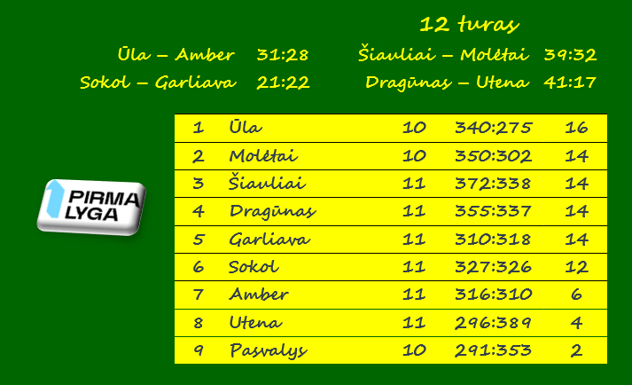 Lietuvos vyrų rankinio pirmosios lygos vienvalde lydere tapo čempionės vardą ginanti Varėnos „Ūla“. Dzūkai sekmadienį 12-ajame ture namie nugalėjo Vilniaus „Amber“ jaunimą 31:28 (16:13) ir pasinaudojo tuo, kad pirmąjį pralaimėjimą patyrė „Molėtai“.