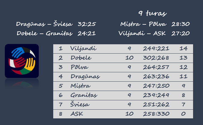 Kitas dvejas Baltijos lygos rungtynes sekmadienį laimėjo stipriausi Estijos klubai. Baltijos lygos čempiono vardą ginantis Pylvos „Serviti“ išvykoje nugalėjo Rasiku „Mistra“ 30:28, šio sezono Baltijos lygos lyderis „Viljandi“ namie įveikė Rygos ASK 27:20.