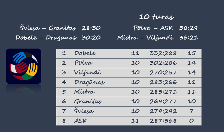 Kitos dvejos Baltijos lygos rungtynės šeštadienį vyko Estijoje. Čempionės vardą ginanti Pylvos „Serviti“ įveikė autsaiderį Rygos ASK klubą 38:29 (21:15), o Rasiku „Mistra“ nelauktai sutriuškino buvusį vienvaldį lyderį „Viljandi“ klubą 36:21 (19:9).