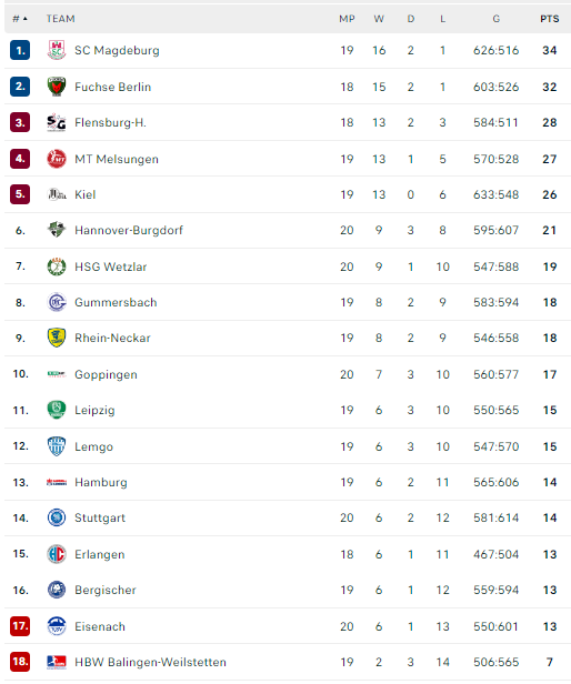 Pirmauja: „Magdeburg“ – 34, „Füchse“ – 32, „Flensburg“ – 28, „Melsungen“ – 27, „Kiel“ – 26, „Hannover“ – 21, … „Stuttgart“ – 14.