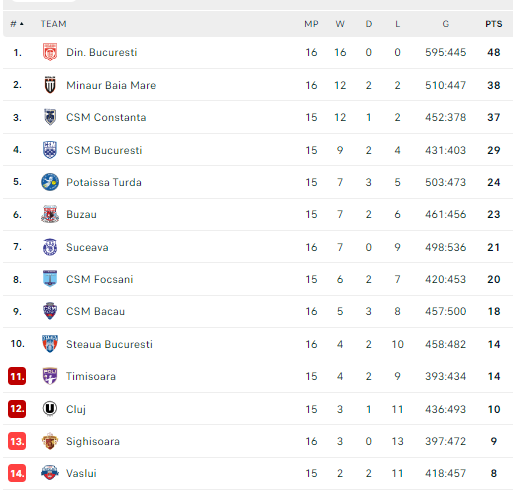 Pirmauja: „Dinamo“ – 48, „Minaur“ – 38, „Constanța“ – 37, Bukarešto CSM – 29, „Potaissa“ – 24, „Buzău“ – 23, … „Bacău“ – 18.