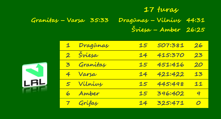 Kauno „Granito“ rankininkai išsklaidė, ko gero, paskutines Alytaus „Varsos“ viltis pakilti į trečiąją vietą. Lentelės kaimynų dvikovoje namie žaidęs „Granitas“ pasiekė pergalę 35:33 (18:15). Šiose rungtynėse net 15 įvarčių pelnė kauniečių puolimo lyderis Modestas Štarolis, pasiekęs lygos sezono rezultatyvumo rekordą.