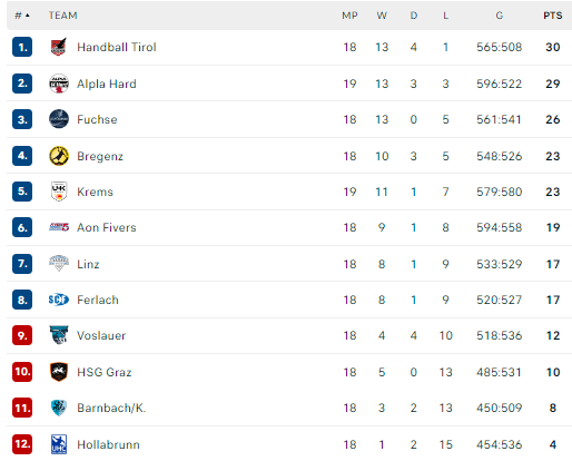 Pirmauja: „Tirol“ – 30, „Alpla“ – 29, „Füchse“ – 26, „Bregenz“, „Krems“ – po 23.