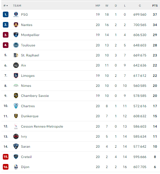 Pirmauja: PSG – 37, „Nantes“ – 34, „Montpellier“ – 29, „Toulouse“ – 28, „St.Raphael“ – 23, „Aix“, „Limoges“ – po 22.