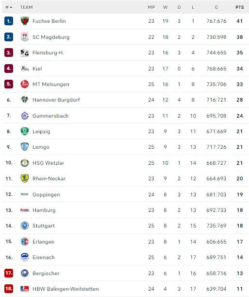 Pirmauja: „Füchse“ – 41, „Magdeburg“ – 38, „Flensburg“ – 35, „Kiel“ – 34, … „Stuttgart“ – 18.