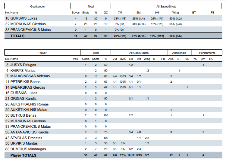 Rezultatyviausiai Lietuvos rinktinėje žaidė labiausiai patyręs rankininkas Aidenas Malašinskas. Jis įmetė 8 įvarčius. 37 metų įžaidėjas šešis kartus nuginklavo varžovų vartininkus per pagrindinį laiką, įmetė baudinį per pirmąją baudinių seriją ir pelnė pergalingą įvartį pratęsus baudinyną.