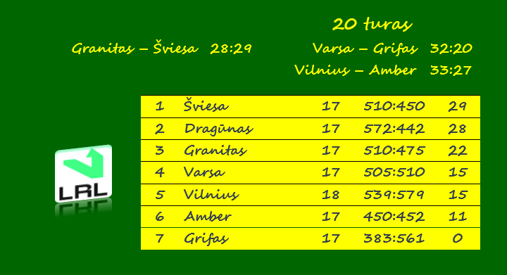 Kad „Granitas“ bus trečias, paaiškėjo prieš kelias savaites. Tuo tarpu dėl kitų trijų vietų kovojusios komandos lemiamus taškus sudėliojo trečiadienį 20-ajame ture. Jame „Varsa“ namie nugalėjo „Grifą“ 32:20 (18:9), „Vilnius“ – „Amber“ 33:27 (19:11).