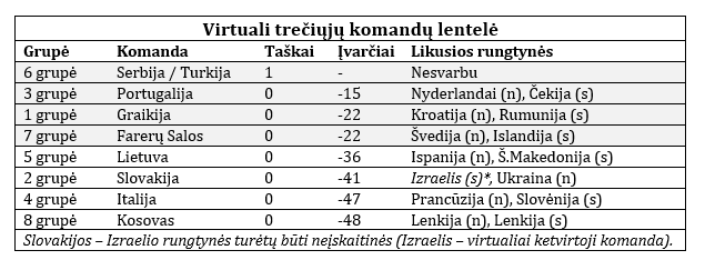 Lietuvos rinktinės įvarčių skirtumas šiuo metu yra -36 (per rungtynes su ispanėmis ir makedonėmis). Lietuvės virtualioje trečiųjų komandų lentelėje užima penktąją vietą. Šioje lentelėje pirmauja vieną tašką turinti Turkija (6-oji grupė), o pagal įvarčių skirtumą geriausioje padėtyje yra Portugalija (-15; per paskutinį atrankos langą 3-iojoje grupėje susitiks su Nyderlandais ir Čekija), Graikija (-22; 1-ojoje grupėje su Kroatija ir Rumunija) bei Farerų Salos (-22; 7-ojoje grupėje su Švedija ir Islandija).
