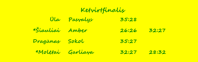 „Šiauliai“ – Vilniaus „Amber-2“ 32:27 (16:16). Butkus 10, Baliutavičius 6, Budraitis 6, Budrys 5, Jocas 5 / Labutis 9, Bogdiunas 6, Morkūnas 5. Pirmosios rungtynės 26:26.
