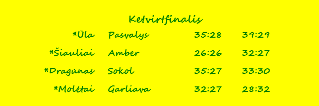 Varėnos „Ūla“ – Pasvalio „Top Ranga“ 39:29 (16:16). Eidukonis 8, Zadarnauskas 7, Daškevičius 6 / Vaškevičius 7. Pirmosios rungtynės 35:28.